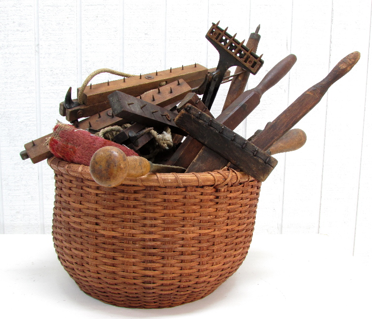 Antique collection of carpet installation tools displayed in basket sizes vary 19th C.