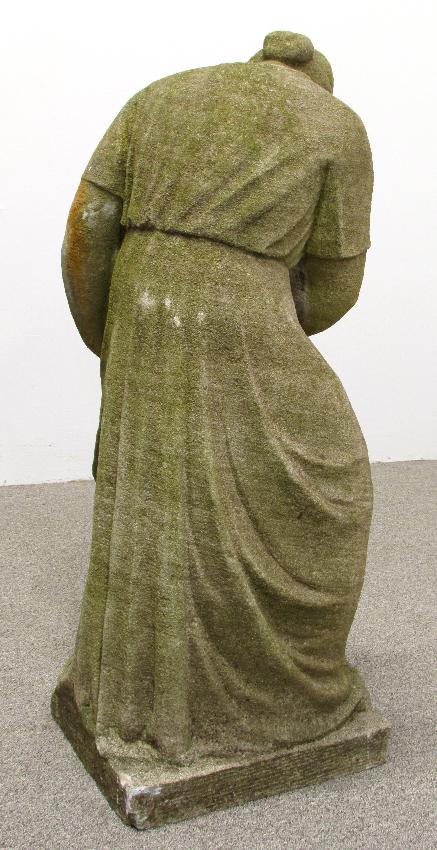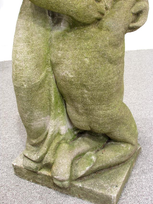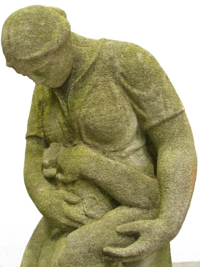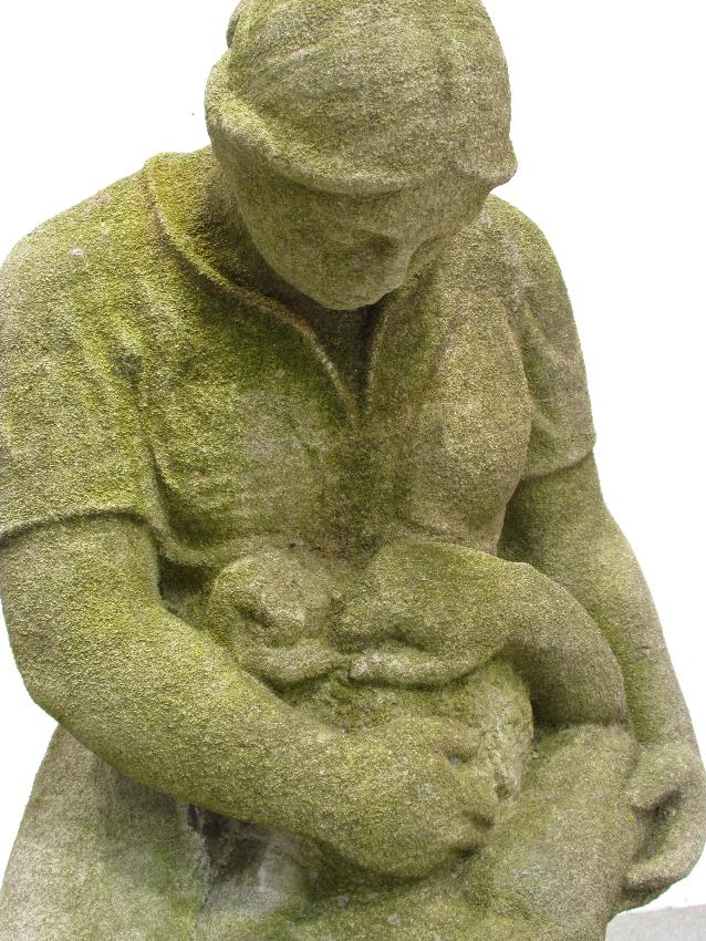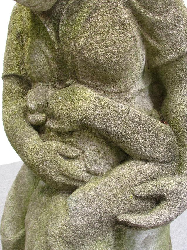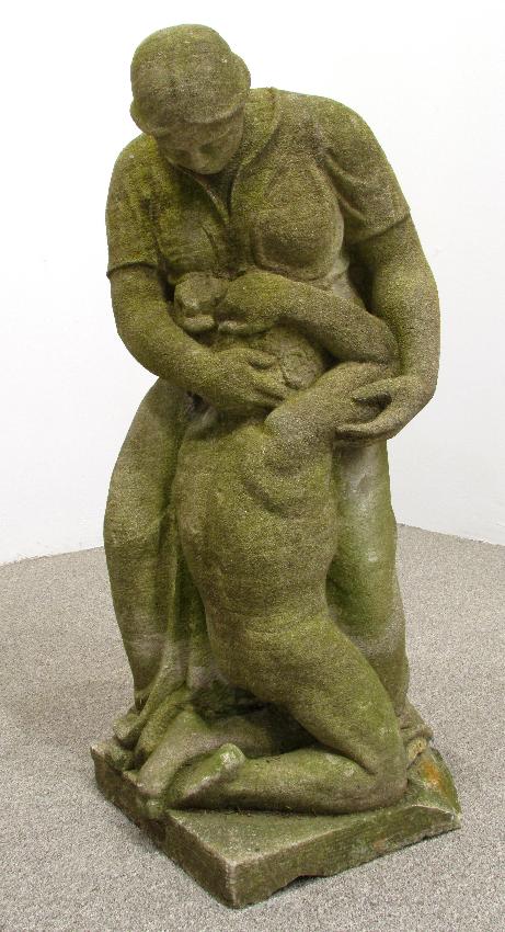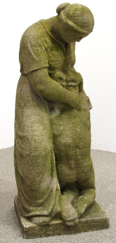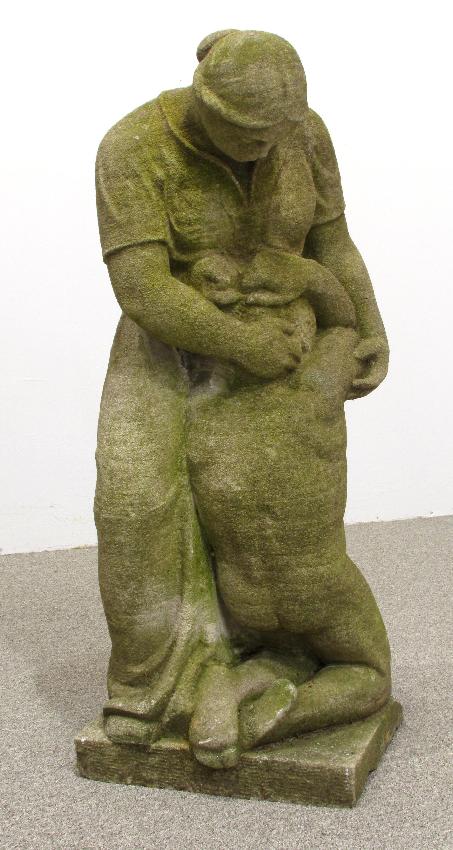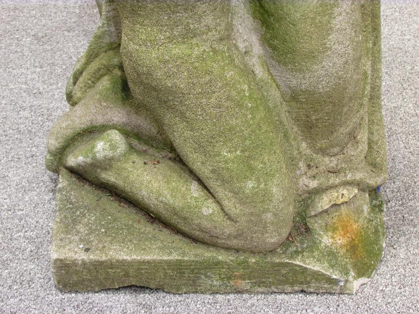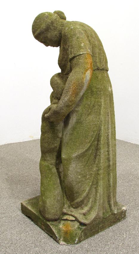 Carved limestone statue of a woman comforting a man on his knees worn and weathered patina 1920's 34 in .H x 11 in. W x 17 in.D