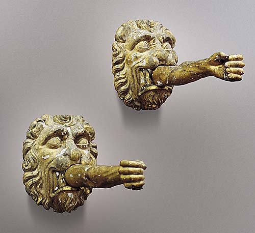 Pair Carved Wood Gilt Lions Mask with Arms Venetian 18th C. each 12 1/2"H 21"L 10 1/2" W
